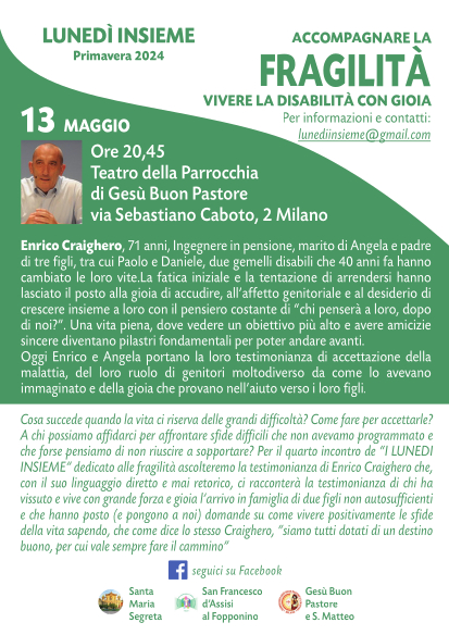 Lunedì insiemeFopponino Milano10 mag 2024Tempo di lettura: 1 minAccompagnare la fragilità Vivere la disabilità con gioia 13 maggio ore 20.45 Per i dettagli apri il volantino